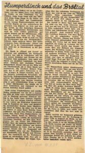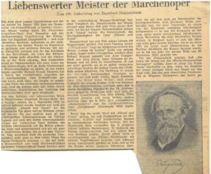 Die beiden Artikel würdigen Leben und Werk des Komponisten Engelbert Humperdinck anlässlich seines 100.Geburtstags und betonen besonders seine Bedeutung als Schöpfer der Märchenoper Hänsel und Gretel. Sie beschreiben seinen künstlerischen Werdegang, seine Nähe zu Richard Wagner, seinen eigenen musikalischen Stil sowie sein tiefes Verwurzelt sein in der deutschen Landschaft und Volksliedtradition. Zudem wird hervorgehoben, wie Eindrücke aus dem Bröltal und seiner Heimat seine Musik prägten und wie seine Opern bis heute anhaltende Popularität besitzen.