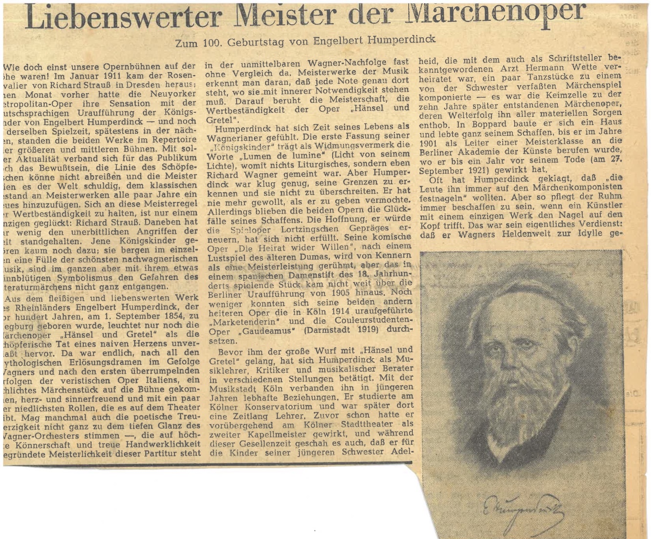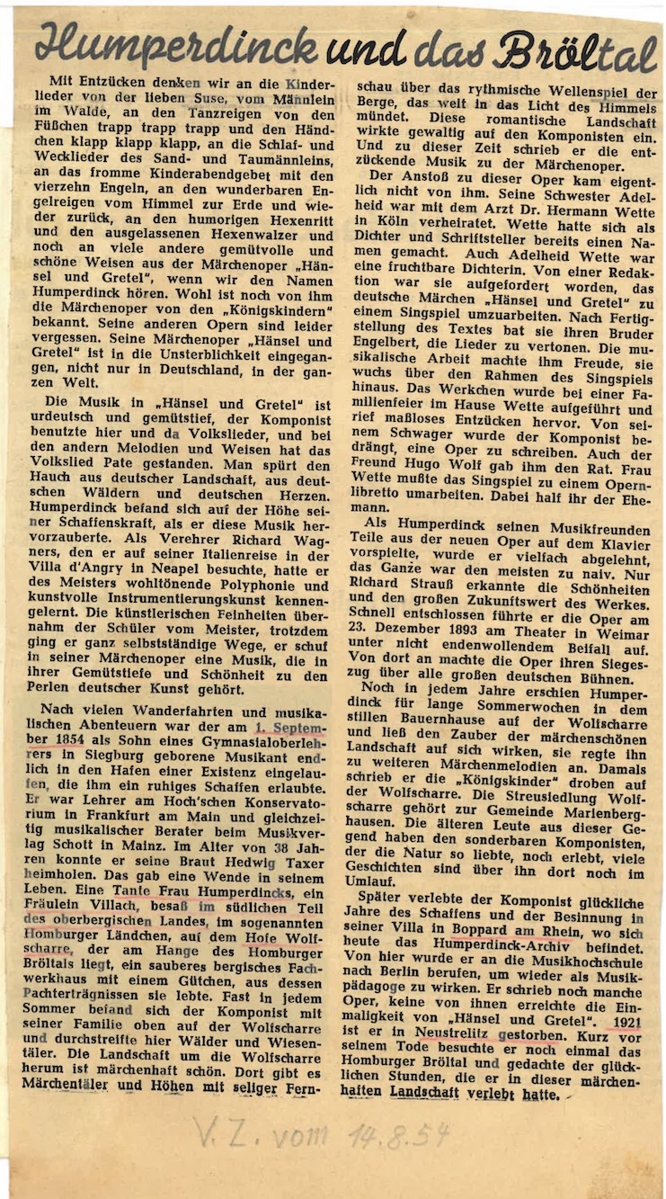 Die beiden Artikel würdigen Leben und Werk des Komponisten Engelbert Humperdinck anlässlich seines 100.Geburtstags und betonen besonders seine Bedeutung als Schöpfer der Märchenoper Hänsel und Gretel. Sie beschreiben seinen künstlerischen Werdegang, seine Nähe zu Richard Wagner, seinen eigenen musikalischen Stil sowie sein tiefes Verwurzelt sein in der deutschen Landschaft und Volksliedtradition. Zudem wird hervorgehoben, wie Eindrücke aus dem Bröltal und seiner Heimat seine Musik prägten und wie seine Opern bis heute anhaltende Popularität besitzen.