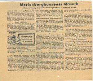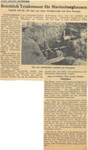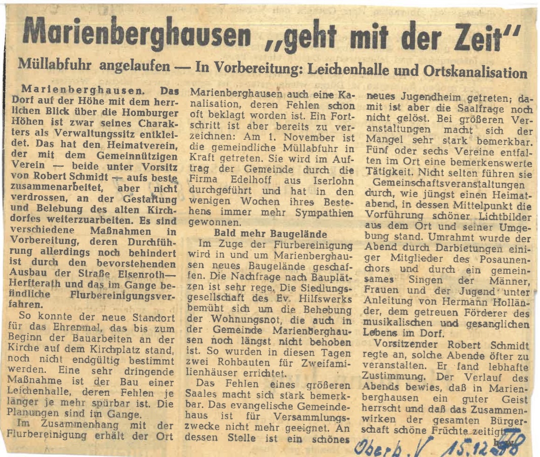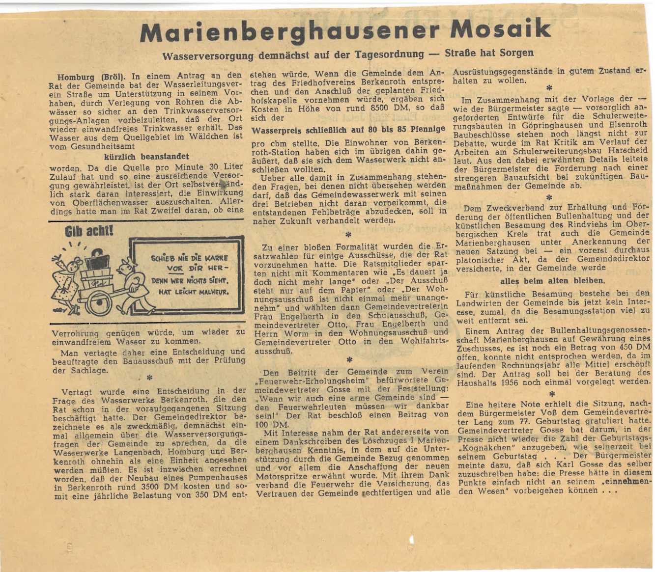 In Marienberghausen waren nach dem Krieg wichtige Verbesserungen für die Dorfgemeinschaft vorangetrieben worden. Um die Trinkwasserversorgung zu sichern, hatten Verantwortliche neue Quellen im Wald erschlossen und nach Untersuchungen als geeignet befunden. Gleichzeitig hatte das Dorf weitere Modernisierungen geplant oder bereits umgesetzt, darunter die Einführung einer regelmäßigen Müllabfuhr, der Ausbau von Straßen, Vorbereitungen für eine Ortskanalisation sowie der Bau einer Leichenhalle.
